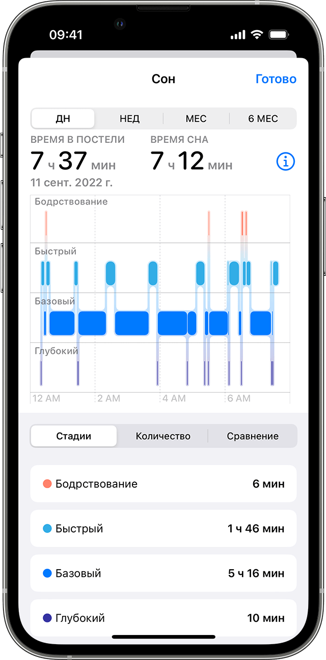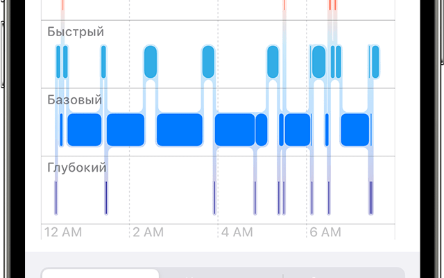 Данные о продолжительности, качестве сна, количестве пробуждений, частоте дыхания и сердечных сокращениях могут быть сохранены в приложении «Сон» на iPhone в виде графиков и отчетов.