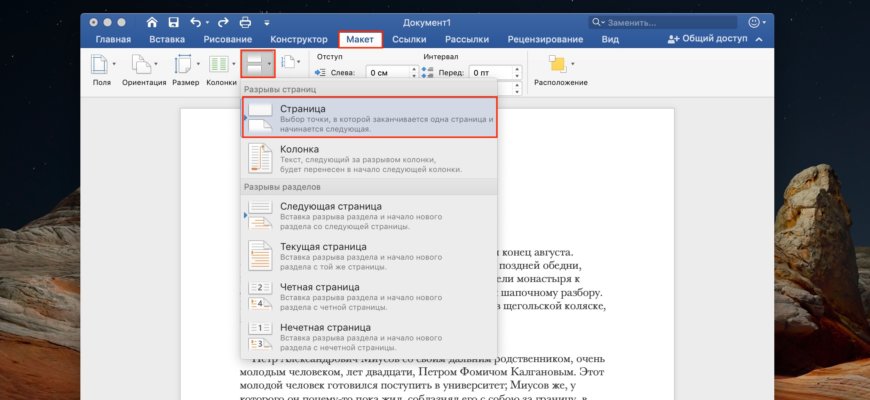 Первым делом, если в Microsoft Word возникает разрыв страницы, необходимо проверить настройки разрыва страницы. Для этого следует перейти во вкладку «Разметка страницы» и выбрать пункт «Разрыв…».